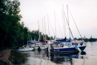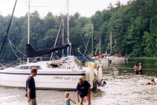 Wednesday was back to Valcour Island. Several boats stayed behind for another day at Burton Island or Deep Bay. This made for a very bouncy ride coming back, for them on Thursday. Those who went to Valcour on Wednesday had another slow, hot ride, and one by one sails were dropped and motors started - swimming couldn't wait another minute. That night we stayed in the bay south of Bluff Point on the west shore. Through sheer good luck we found Bob and Carol (Time Enough). They started out Tuesday from Willsboro Bay and were spending their second night on Valcour Island, not having heard from anyone, but figuring we would be by at some point.
