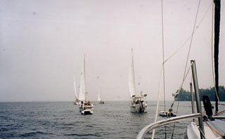 The next day dawned 20 degrees colder, cloudy, and quite breezy. Those at Malletts Bay decided to stay put. The water was still warm for swimming, some did a little day sailing around the bay, and a couple crews moved over to the Champlain Marina to enjoy hot showers. We also picked up 4 bags of trash and a brand new water ski vest left by fireworks watchers from the night before. That night Frank and Sonja invited every one to their house on the east shore of Malletts Bay. We had a wonderful cookout and those of us with empty coolers ordered pizza. Linda Chase brought a yummy key lime pie made in the galley of Change of Heart, a Hunter 30. We enjoyed a beautiful sunset over the bay with the Adirondacks in the background and more music.10 to 20 kt north winds with 2-3' waves were predicted through the weekend.