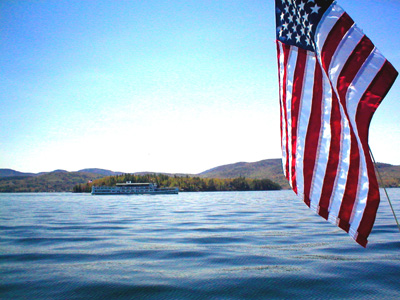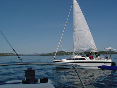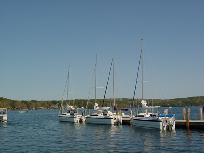 Saturday night wasn't quite as cold but there was frost on the cushions on Sunday morning. Don Huff and Ed's son Ted joined us for the "sail" on Sunday - this time to Wolfboro for ice cream. The day was warmer and again no wind. There were more boats on the lake so we couldn't get near the docks for our ice cream. We had some wind on the way back and thoroughly enjoyed the warm sun and clear skys.