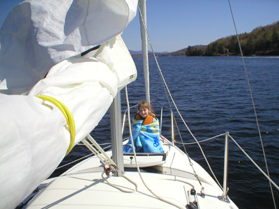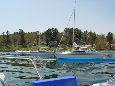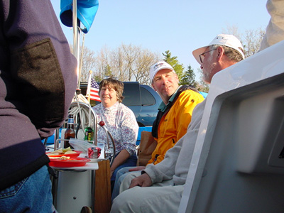 The first NETS/Moane rendezvous of the year was held at Fay's Marina. After quite a bit of rain, Friday cleared up, though it was still unseasonably cold. I was last to arrive at about 4pm. Chuck Healy, a new member, "volunteered" to make arrangements for us at Fay's and was on hand to greet us. George Lavoie and his friend Ron came down from Canton Maine. Ken Fordham and his wife Marilyn and friend Josiah, who keep their new-to-them Catleina 25 at Fays, were there getting their boat ready for the summer. Chuck and his wife Helen and their younger daughter, Brianna brought their boat up from Ames Farm for the weekend. And lastly Ed Goodhue brought his boat up from the Cape and offered me his "guest cabin" for the weekend. After rigging we went out for dinner at the Sawyers and then George and Ron, Ed and I hunkered in for a verry cold night. Saturday dawned chilly, with light winds.